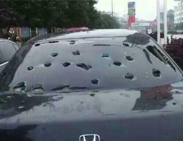4月20日,强对流天气正在广东肆虐,潮州、汕头、揭阳等地除了短时强降雨、瞬时大风外,还下起了冰雹。猛烈袭来的冰雹甚至将户外停放的汽车车窗砸穿。猛烈袭来的冰雹甚至将户外停放的汽车车窗砸穿。