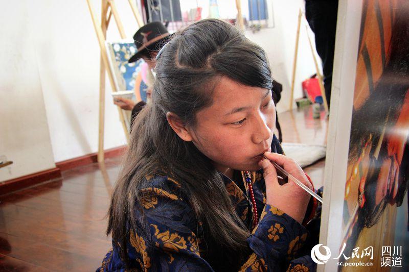 17岁的泽吉拉姆正在绘画一幅唐卡画,并不时地用笔尖在口中蘸唾液,直至把色彩铺得十分轻薄、均匀(朱虹 摄)