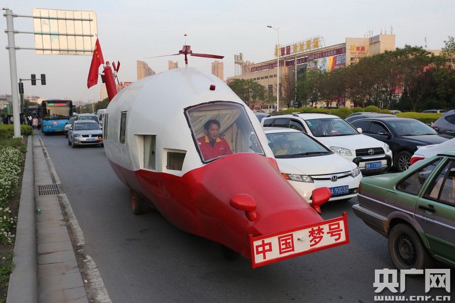 2015年4月21日,河南省郑州市,一架外形奇特的山寨“直升机”闪着警灯拉着警笛行驶在街头,直升机叫中国梦号,还挂着“请勿靠近 随时起飞”的牌子。吸引了众多行人的目光,纷纷围观。