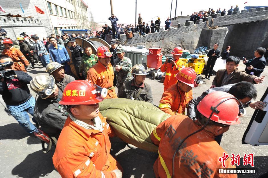 4月21日,山西大同姜家湾煤矿,救援人员将幸存被困矿工抬出矿井。当日下午,山西大同煤矿集团地煤公司姜家湾煤矿“4·19”抢险指挥部发布救援最新进展,截至目前已有3人获救,16人遇难,被困5人仍在全力搜救中。当日中午13时11分,3名矿工成功获救升井,目前生命体征平稳。截至15时30分,井下累计排水6100立方米,地面1、2号孔全面打通。中新社发 韦亮 摄