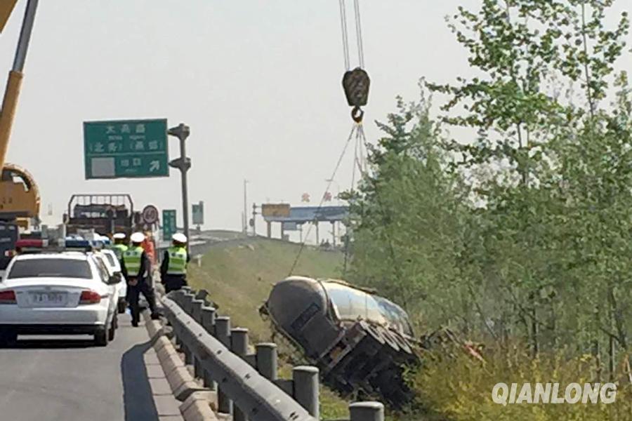 4月22日凌晨,京平高速北务出口附近,一辆水泥罐车发生侧翻事故,现场一段护栏被压毁。据现场交警介绍,封路清障工作至少造成5公里拥堵。截至记者发稿时,封路清障工作完成恢复通车。图为22日上午10时许,水泥罐车被吊车吊起。千龙网记者 王璟玥摄