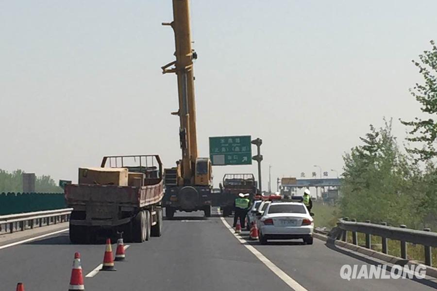 4月22日凌晨,京平高速北务出口附近,一辆水泥罐车发生侧翻事故,现场一段护栏被压毁。据现场交警介绍,封路清障工作至少造成5公里拥堵。截至记者发稿时,封路清障工作完成恢复通车。千龙网记者 王璟玥摄