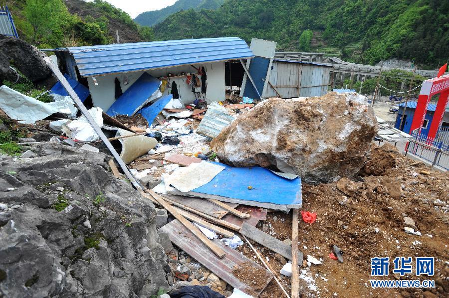 4月22日拍摄的被落石砸中的工棚。当日凌晨,湖北省兴山县水月寺镇高岚村附近,一块约7立方米的孤石从山坡滚落,砸中了下方的一个建筑工棚。经核查,工棚内当时有7名工人。事故已造成5人死亡,2人受伤,伤者正在接受救治。新华社发(李传平 摄)