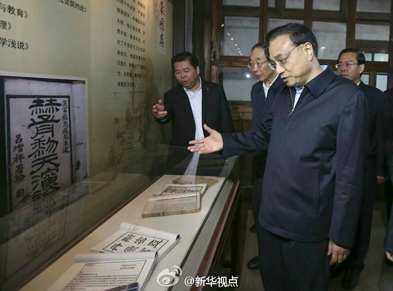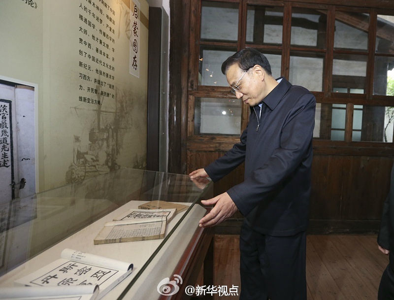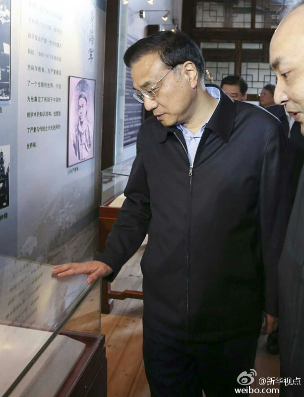 新华网北京4月24日电 据新华社“新华视点”微博报道,李克强24日来到福州三坊七巷参观严复故居。总理说,严复学贯中西,是第一批“放眼看世界”的中国人。他向国人翻译介绍西学,启蒙了几代中国人,同时又葆有一颗纯正的“中国心”。每个中国人都应该记住严复。