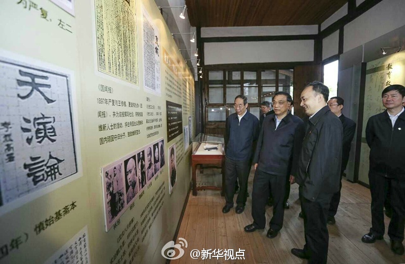 李克强24日考察福州期间专程来到严复故居。工作人员说,《政治学》等经典名著都由严复首次翻译引入国内。总理补充道:还有《国富论》和《论法的精神》。他指着展柜内的《天演论》说,严复的翻译确实做到了信、达、雅,这本书我插队时也读过。