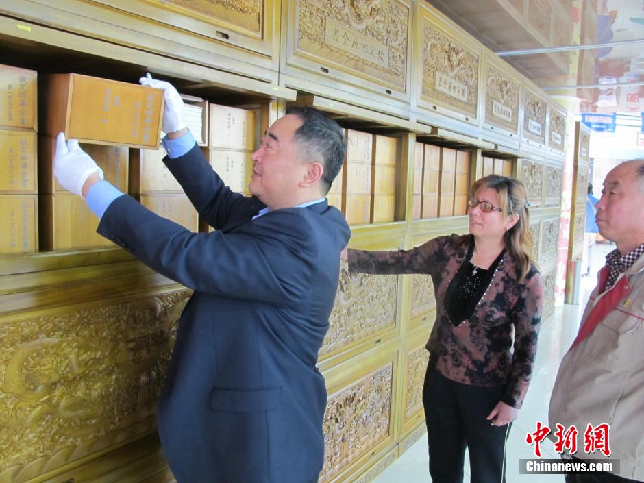 4月23日是世界读书日。当日,文渊阁《四库全书》原样完整复制版公益展示活动在北京举行。《四库全书》是由清乾隆皇帝亲自主持编纂的人类文化史上规模最为宏大的图书,全书分经、史、子、集,是中华传统文化最丰富最完备的集成之作。据介绍,这是首次原大原色完整复制文渊阁《四库全书》,500余名专家、学者、手工造纸工匠、装订艺人和宫廷造办木器制作传人,历时5年完成。全套共36375册图书,6144书函,128组楠木书柜。中新社发 伍鹏程 摄