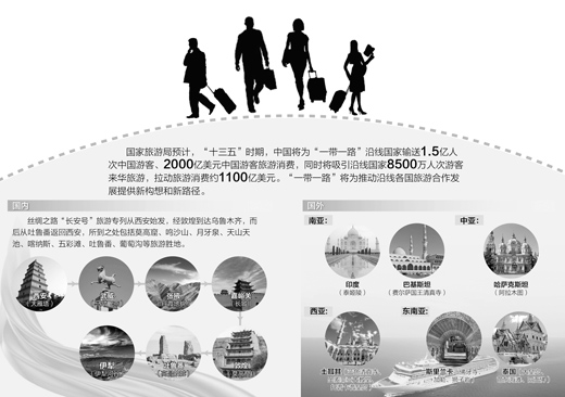 “一带一路”旅游潜力巨大。国家旅游局预计,“十三五”时期,中国将为“一带一路”沿线国家输送1.5亿人次游客、2000亿美元旅游消费,同时将吸引沿线国家8500万人次游客来华旅游,拉动旅游消费约1100亿美元。