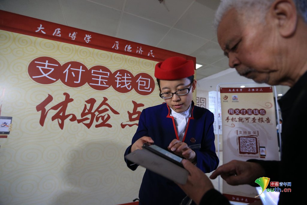 西苑医院服务台人员在介绍和帮助患者使用支付宝挂号。