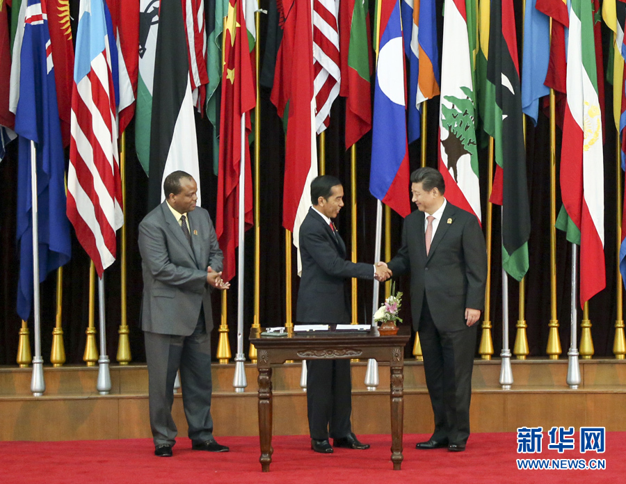 4月24日,在印度尼西亚参加亚非领导人会议的各国领导人来到万隆,纪念万隆会议召开60周年。这是中国国家主席习近平同印尼总统佐科和斯威士兰国王姆斯瓦蒂三世共同签署《2015万隆公报》。新华社记者 马占成 摄