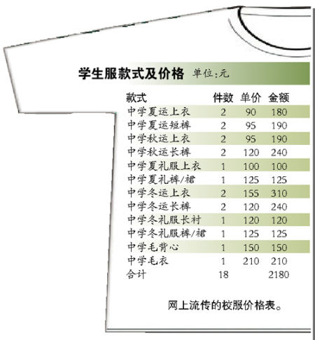 通知显示,该校服由深圳市思贝特服饰有限公司制作。记者致电该公司一名孙姓经理,孙经理证实,该公司确实帮东莞外国语学校制作了一批校服,全套需2180元也是事实。同时,孙经理表示,单价、面料、质地、款式等都是按照东莞市统一招标要求去做的。“单价不是跟学校签,也不是我们单方面定,是按照教育局2014年的招标文件执行的。”