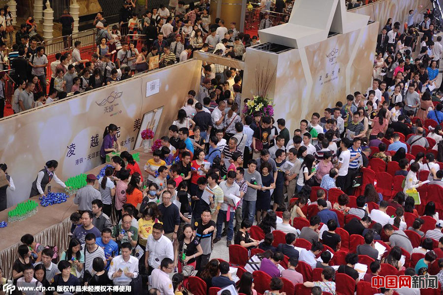 2015年04月26日,广东省深圳市,港铁·天颂在深圳市福田区大中华国际交易广场开盘,开盘当天推出约600套住宅单位,均价3.4万,吸引3000多人入场抢购,3小时卖光。雨歌/CFP