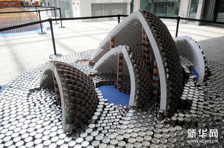 4月27日,香港食物回收机构“惜食堂”在香港中环元创方举办“爱心罐香港2015”活动,利用50000个易拉罐堆砌以世界名胜为题的巨型创意作品,希望引起人们对基层人士饥饿问题的关注。
