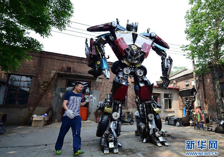 35岁的河北小伙路鹏从小就对变形金刚有着浓厚兴趣。3年前自路鹏制作的第一个变形金刚出炉后,他就有了辞职创业的想法。2014年6月,路鹏辞掉了收入稳定的白领工作,在天津市东丽区租下了一处旧厂房,和来自老家的4个师傅一起用废旧汽车零件制作变形金刚,正式开启了都市白领的“机械创业梦”。路鹏的团队陆续制造出了“擎天柱”“威震天”“大力神”等一批庞然大物。路鹏对记者说:“以前自己的工作是穿着西服、喷着香水、吹着空调,看似不错但并不快乐,现在自己一身油漆、风吹日晒,但却非常享受,尤其是看着自己亲手设计制作的作品非常幸福。”