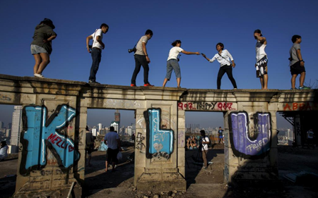 4月19日,泰国曼谷,游客站在废弃建筑物“Sathorn Unique”的屋顶。泰国烂尾楼SathornUnique可谓是泰国人尽皆知的一栋烂尾楼。这幢建筑有“幽灵塔”之称,这座49层高的摩天大厦原本是用来建造先进的商务中心及酒店公寓的,在其上可以饱览湄南河的美景,但受累于97金融风暴,其最终被彻底放弃,从而沦为“鬼楼”。如今,这座174米高建筑的墙壁上已经布满了涂鸦,并且其间还居住着很多非法占用者。