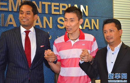 4月27日,在马来西亚普特拉加亚市,羽毛球名将李宗伟(左)与马来西亚青年与体育部长凯里(中)出席新闻发布会。世界羽联27日宣布,马来西亚羽毛球名将李宗伟因服用禁药被禁赛8个月。禁赛期从他2014年8月在哥本哈根参加世锦赛期间接受检验的时候开始算起。这意味着李宗伟今年5月将可以重返赛场。