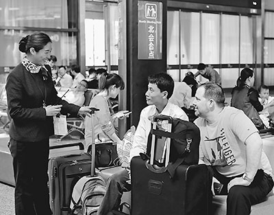 4月27日,上海铁路局虹桥站工作人员在标注醒目的亲友会合点帮助旅客寻找亲友。面对“五一”小长假前后的客流高峰,虹桥火车站各个雷锋服务点开展重点旅客预约服务,为“老、弱、病、残、孕”重点旅客提供往返迎送服务,并配备晕车药、创可贴等应急药品,尽可能为旅客打造舒适、便捷的出行环境。