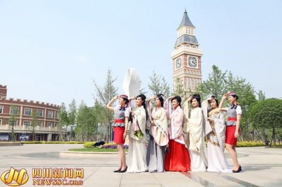 照片中,八名准空姐有的身穿汉服、有的身穿空姐制服,或清纯可爱、或端庄优雅、或性感动人。记者了解到,这组照片是四川西南航空专修学院空乘专业的八名女生拍摄的毕业照。“我们都是同一个寝室的好姐妹,即将毕业分离,又都对汉服感兴趣,所以拍摄了这组创意毕业照,来纪念我们的大学和青春。”照片主角之一谢明敏告诉记者。
