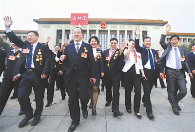 4月28日上午,2015年庆祝“五一”国际劳动节暨表彰全国劳动模范和先进工作者大会在北京人民大会堂举行。图为参会的劳模们步出会场。本报记者 杨登峰 摄