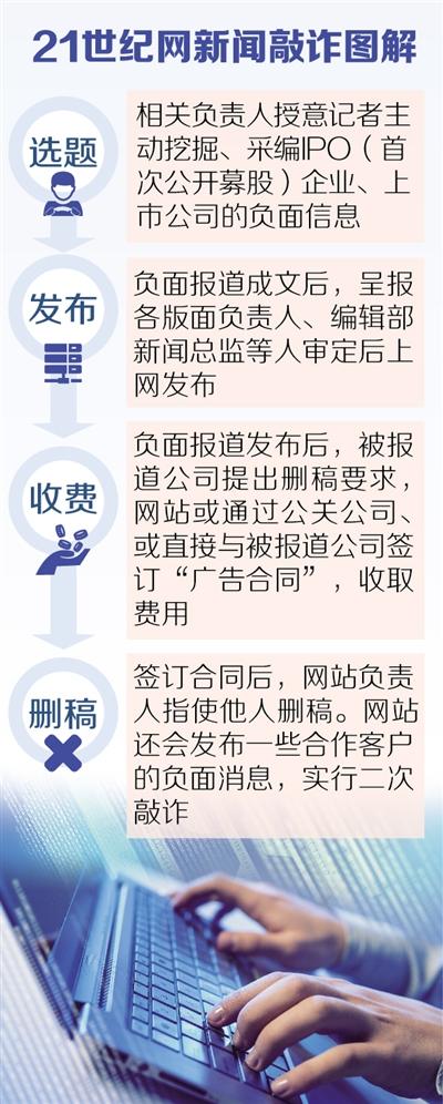 据国家新闻出版广电总局相关负责人介绍,2014年9月3日以来,21世纪网、《理财周报》和《21世纪经济报道》先后有多人被上海市公安机关采取强制措施,其中有21人被检察机关批准逮捕。案件发生后,国家新闻出版广电总局和广东省新闻出版广电局开展行政调查。经查:21世纪网和《理财周报》主要负责人勾结公关公司,指使新闻采编人员以对上市公司和拟上市公司负面报道相要挟,迫使相关企业签订广告认刊书、服务协议,谋取不正当利益。同时查明,21世纪网、《理财周报》和《21世纪经济报道》还存在采编和经营不分等违规问题。