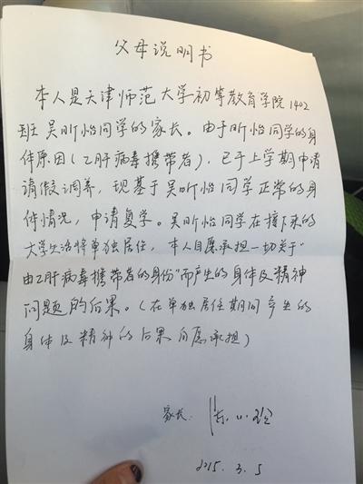 吴昕怡 女,福建福鼎人,天津师范大学初等教育学院大一学生,2015年4月10日,她在学校单间宿舍烧炭自杀。在学校的一次义务献血之后,2014年12月6日,她被查出大三阳,系乙肝病毒携带者;今年3月7日,被安排进单独的学生宿舍居住。