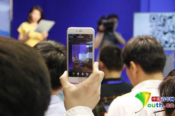 在活动现场正通过手机进行扫描“青年之声”社交平台的二维码。记者 隗功臣 摄