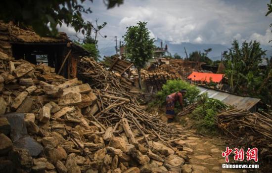 4月30日,一名妇女在废墟中拾起可用的木材。这里是巴斯朗村,位于尼泊尔地震震中廓尔喀县城西郊,全村九成房屋倒塌。中新社发 张浩 摄
