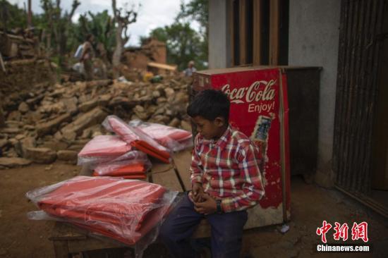 4月30日,一名小朋友在即将发放的物资前。这里是巴斯朗村,位于尼泊尔地震震中廓尔喀县城西郊,全村九成房屋倒塌。中新社发 张浩 摄