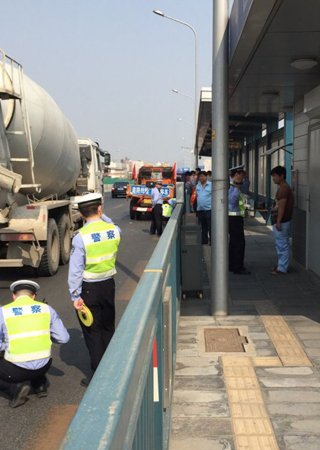今日14时许,北京海淀区阜石路桥上,一名正在公交站台工作的养路工人被一辆混凝土车撞倒身亡。