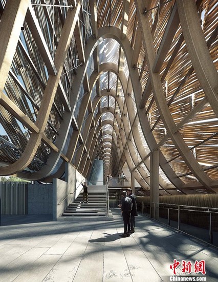 中国馆的建筑外形从空中看,如同希望田野上的一片“麦浪”。正立面是整个建筑流线最高潮的部分——高耸的胶合木结构屋架,宛如“群山”。设计师以此向中国传统的抬梁式木构架屋顶致敬,也为观众提供了可以纪念留影的巨大空间。