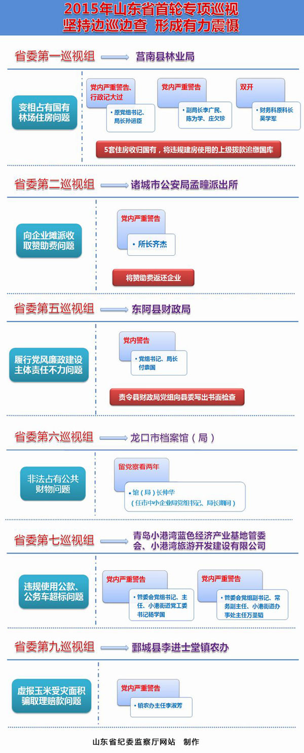 省委第二巡视组对群众反映的诸城市公安局孟疃派出所所长齐杰向企业摊派收取赞助费问题,移交核实后,诸城市纪委给予齐杰党内严重警告处分,责令将赞助费返还企业。
