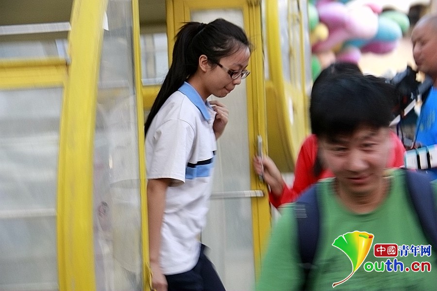 高三学生顾思佳(中)成为摩天轮最后的乘客。图为顾思佳走下摩天轮的一瞬间。 中国青年网记者 隗功臣摄