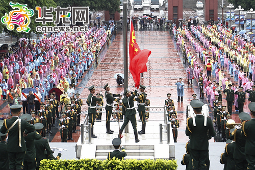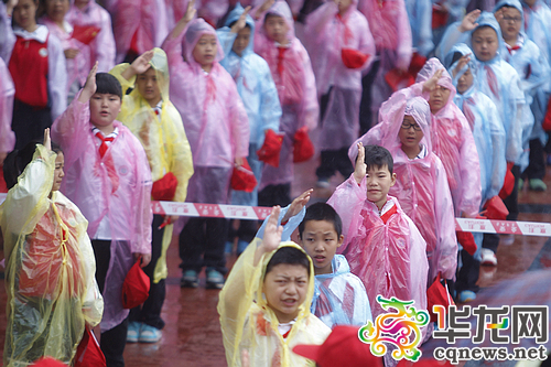 来自南川区隆化第一小学的500名优秀少先队员和留守儿童代表及全市青少年代表冒雨参加了升国旗仪式。记者 蒋霞曦 摄