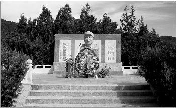 在纪念馆上方的碑地入口处有一座牌楼,上面所刻的“白乙化烈士千古”正是原八路军冀热察挺进军司令员萧克的手笔。穿过牌楼,一条石板铺成的甬道直抵山顶。庄严肃穆的白乙化烈士纪念碑就矗立在这巍峨的山顶上。5米见方的碑座由花岗岩条石砌成,上有汉白玉围栏,四周栽植的柏树茂密挺拔,上面系着前来凭吊者带来的小白花。