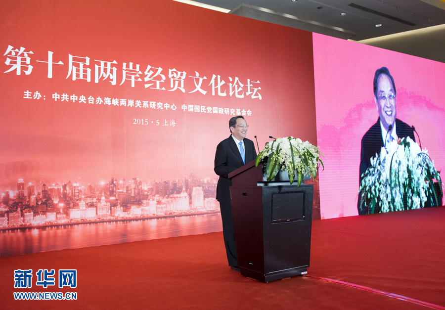 5月3日,由中共中央台办海峡两岸关系研究中心和中国国民党国政研究基金会共同举办的第十届两岸经贸文化论坛在上海浦东隆重举行。中共中央政治局常委、全国政协主席俞正声和中国国民党主席朱立伦出席论坛开幕式并致辞。这是俞正声在致辞。新华社记者 王晔 摄