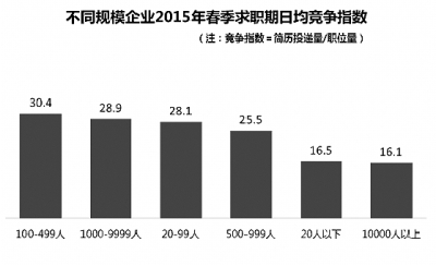 智联招聘近日发布《2015年春季中国雇主需求与白领人才供给报告》,报告显示,2015年春季,中型企业成为白领求职者首选,人才供需竞争指数(收到的简历投递量/发布的职位数量)超过30。