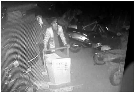 监控截图:一人推着推车,一人用手机照明,就这样把保险箱偷走了。