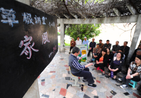合肥市和平路街道打造社区居民身边的“百家讲坛”,开办“草根讲堂”。社区居民在开满紫藤花的凉亭下聆听80岁老人吴成宗讲家风 杜宇摄.