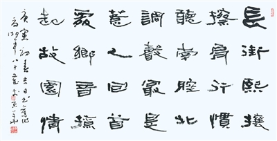 在中国书法史上,隶书于汉魏时蔚然大观,后世能超群拔俗者寥寥可数,兹夏湘平先生得之矣。“夏隶”风格独特,读者过目不忘。夏先生拈出《石门颂》体系的脉络神髓,抽象之、夸张之、符号之,发挥广大,岂其易哉!它的“反结法”,结构与解构两法不一不异,左右逢源,相得益彰。文字部件的“不争”,使得中宫开阔,有庙堂气;同时增加出无形的审美趣味,扩展出无限的思维空间。“夏隶”书体的笔法,碑与帖合而为一,兼具碑的厚重拙朴与帖的巧妙灵活,其用笔颤掣,筋骨崚嶒,如锥如锤,比之折股画沙,多出雕刻感;隶韵草情,局部笔画仿佛缪篆姿态,添装饰之美。“遂觉已步入褒斜道上,侧身于石门左右,时而又遥领庙堂之肃穆”,欧阳中石先生在跋夏湘平书周敦颐《爱莲说》书卷中有此语,真知音也。