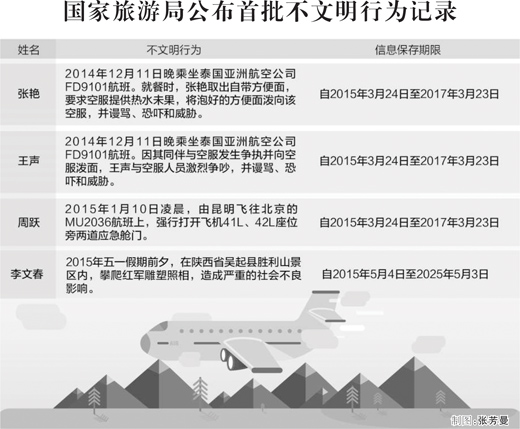 大闹亚航、打开飞机应急舱门、攀爬红军雕塑照相……在《游客不文明行为记录管理暂行办法》(简称《暂行办法》)施行后,国家旅游局日前公布了首批全国游客不文明行为记录。