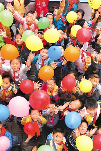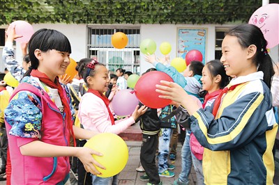 5月7日,山东省枣庄市红旗小学开展“传递微笑 健康成长”活动,小学生们利用“笑脸”气球做“传递微笑”互动游戏。此活动旨在引导学生们用灿烂、阳光的微笑度过每一天,健康成长,快乐庆祝5月8日世界微笑日的到来。