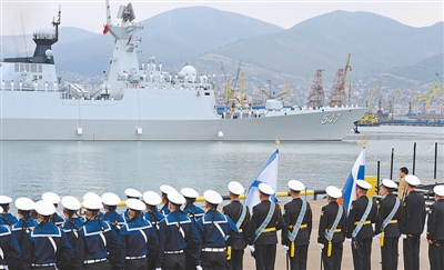 当地时间5月8日上午,由中国海军导弹护卫舰临沂舰、导弹护卫舰潍坊舰、综合补给舰微山湖舰组成的中俄“海上联合-2015(Ⅰ)”军事演习中方参演舰艇编队抵达俄罗斯新罗西斯克市,俄方举行了隆重的欢迎仪式。本报记者 李 靖摄