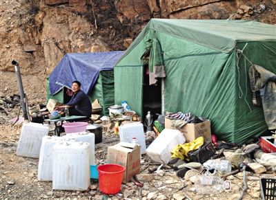 转过几道山岗,成片的黄褐色矿料映入眼帘。矿洞口扎着两顶帐篷,是工人们的临时工棚。油桶、水桶、炉火、发电机、弹簧床,生活设施一应俱全,甚至还有电视。