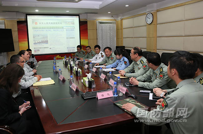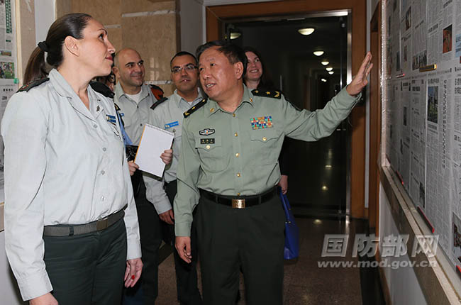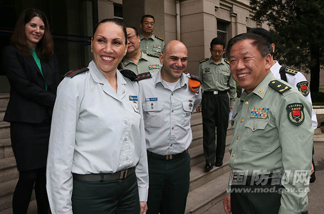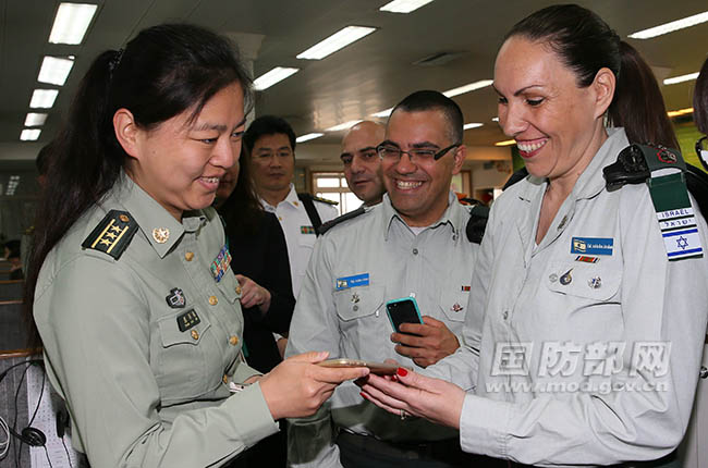 解放军报社副总编辑张海平少将与以色列国防军副发言人艾瑞拉上校交流。 解放军报记者穆可双摄