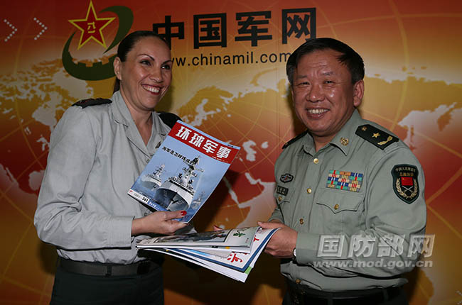 解放军报社副总编辑张海平少将向以色列国防军副发言人艾瑞拉上校赠送解放军报旗下刊物。 解放军报记者穆可双摄