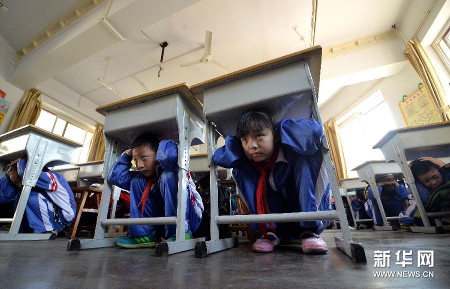 5月11日,河北省邯郸市沁河小学的学生参加防震减灾演练。当日,河北省邯郸市和平街道办事处联合沁河小学开展“防灾减灾演练”安全教育活动,以强化学生们的安全意识,提高自救自护能力。新华社发(郝群英 摄)