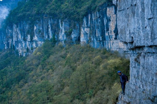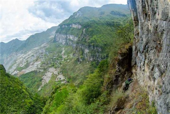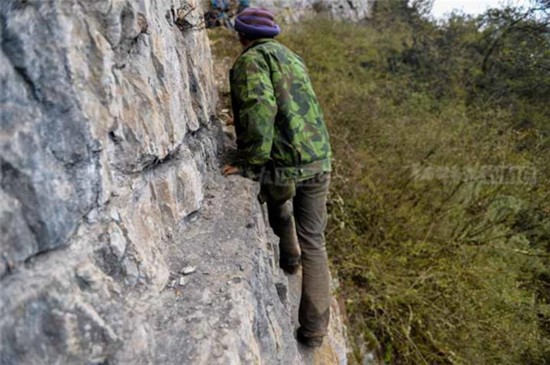 脚下道路不到20厘米宽,在通过岩壁横切面时,边国仲异常小心谨慎。