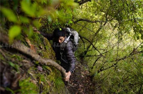 途中不得不借助藤条攀登,曾经有人失足从这里坠下,幸被灌木阻挡保命。