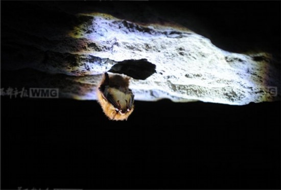 洞里的燕窝越来越少,一只蝙蝠正在岩壁上休息。