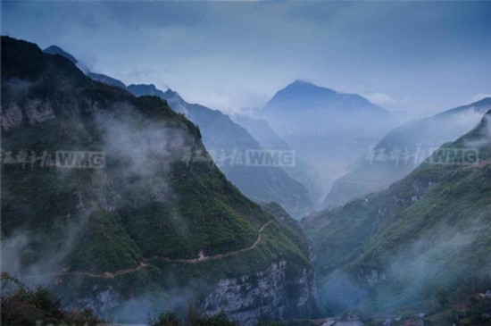 一条机耕道是通往永利彝族乡杉树村马鞍山组的唯一道路,大渡河大峡谷就在远处的云雾之中。
