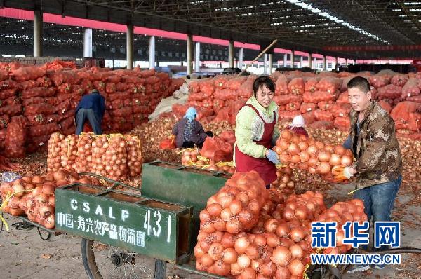 4月15日,工人在山东寿光农产品物流园装运洋葱。在中国蔬菜物流图上,山东南部的兰陵县与上海之间形成了一条高密度大流量的繁忙交通线;北部的寿光市则如同一簇漂亮的烟花,向北京等周边地区散发出强大的集散效应。因为蔬菜,山东的寿光、兰陵,分别与北京、上海两个特大中心城市结下了不解之缘。在北京蔬菜市场上,大约有1/3的蔬菜来自寿光;而上海,对兰陵蔬菜的依赖度则高达50%。新华社记者朱峥 摄